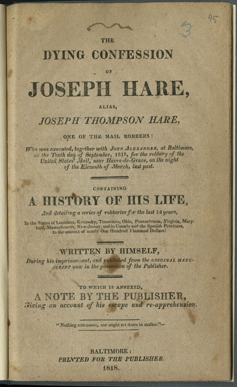 The Dying Confession of Joseph Hare. Baltimore: Printed for the Publisher, 1818.