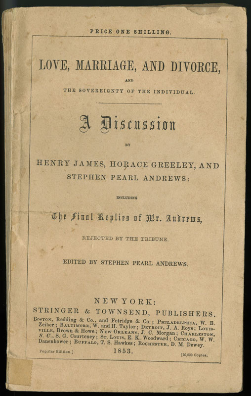 Henry James. Love, Marriage, and Divorce, and the Sovereignty of the Individual. New York: Stringer and Townsend, 1853.