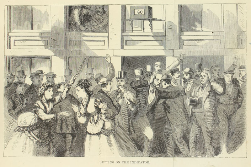 As an object lesson, Felton wrote extensively about the 1869 Gold Crash (“Black Friday”), a financial panic caused by the attempts of investors Jay Cooke and James Fisk to corner the gold market, thus leading many people (but neither Cooke nor Fisk) to financial ruin. This image, “Betting on the Indicator,” depicts people standing outside the stock exchange placing side wagers on gold’s wildly fluctuating price.
