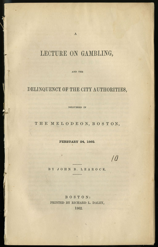 John B. Learock. A Lecture on Gambling, and the Delinquency of the City Authorities. Boston: Richard L. Daley, 1862.